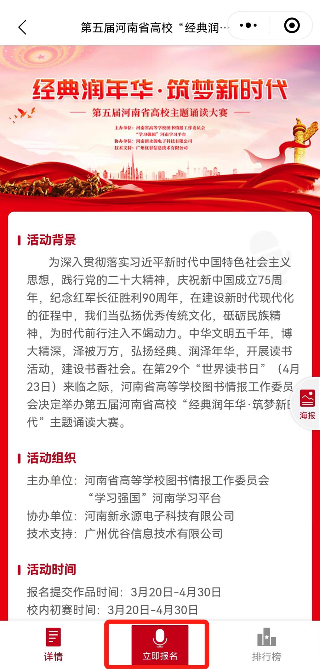 1. 扫描下方活动二维码进入诵读平台,点击活动页面下方【立即报名】,根据系统提示允许获取头像、昵称、地区等相关信息