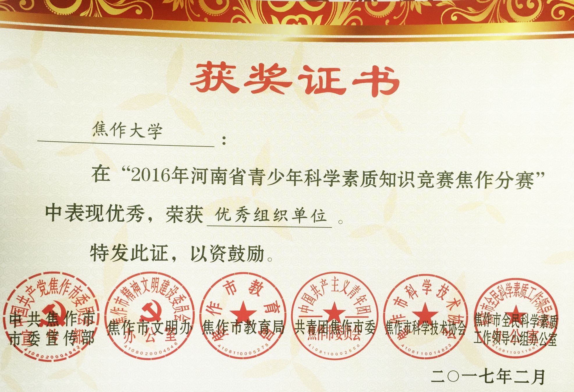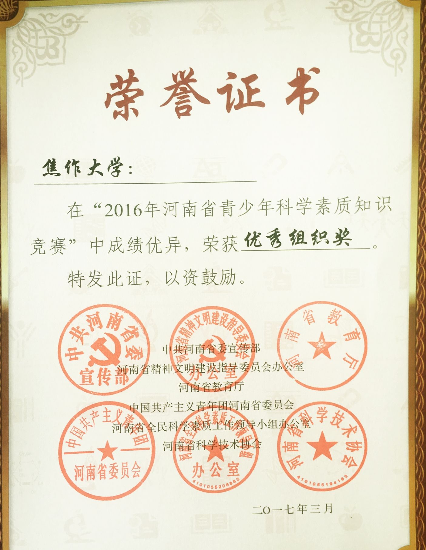 近日,威尼斯官网荣获2016年河南省青少年科学素质知识竞赛“省级优秀组织奖”和“市级优秀组织奖”。河南省青少年科学素质网上知识竞赛是由省委宣传部、省文明办、省教育厅、共青团河南省委、省素质办、省科协主办,本届竞赛以“走进创客、体验创新”为主题,共有52.5万名学生参与本次竞赛。威尼斯官网在得到竞赛通知后积极组织各院系上网注册答题,在全校范围内掀起了“学科学、爱科学、讲科学”的热潮。