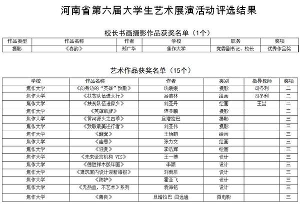据了解, 河南省大学生艺术展演活动每三年举办一届,是河南省目前规模最大、影响最广的艺术盛会。本届活动以“奋斗﹒创新﹒奉献”的主题,比赛从2019年11月到2020年11月,历时一年。3200威尼斯vip党委高度重视、校团委积极组织,在艺术学院的通力协作与配合下,在作品指导教师的辛勤创作和耐心指导下,参赛学生克服困难、精心创作,喜获佳绩。