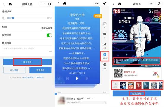 同时,优秀作品将被优谷朗读平台和各参赛单位收录,进行线上线下展播。