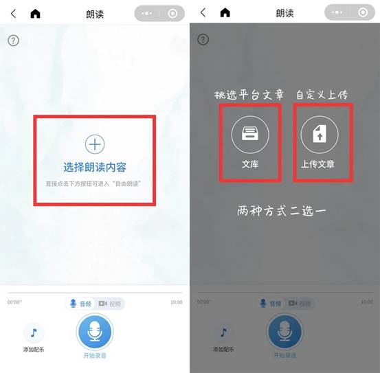 ③点击+号,进入“优谷文库”,请围绕“悦读·新知·致敬”主题选择文库中合适的素材进行朗读,要求内容健康积极、展示青年学生的精神面貌担当,也可以自己上传素材朗读。
