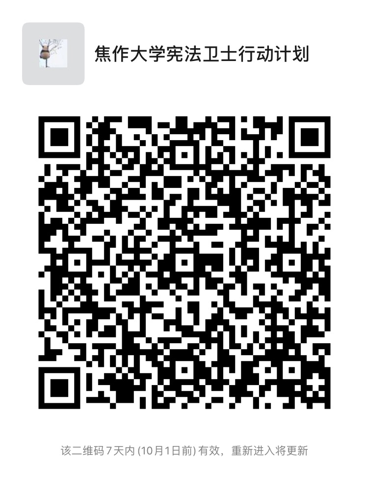 (三)做好支持保障。各院部、各部门要建立健全工作机制,认真组织广大师生参与行动计划。请各院部、各部门明确专人负责此项工作,加入“3200威尼斯vip宪法卫士行动计划”工作微信群(二维码见下方)。
