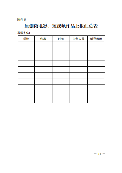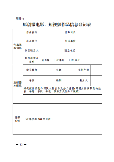 以各总支为单位择优推荐原创微电影、短视频作品不少于1部,5月24日前将推荐的作品优盘,以及《原创微电影、短视频作品信息登记表》(附件 4)、《原创微电影、短视频作品上报汇总表》(附件5),按要求加盖公章,同时将表格电子版、视频百度网盘链接发送到指定邮箱jzdxxcb@163.com。