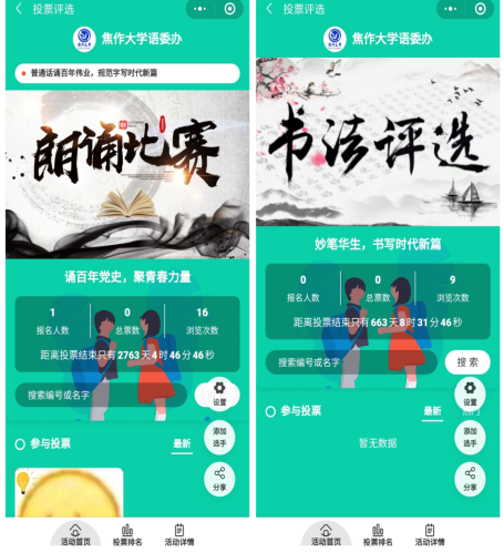 (一)普通话迎百年党庆,赤子心传红色基因。开展“诵百年党史,聚青春力量”推广普通话朗读比赛。学生可通过微信小程序“投票评选工具”上传作品进行参赛,小程序网络评选按票数,分一、二、三等奖(分别设:1名、3名、5名)。本次比赛的评比,旨在朗读比赛中体现出焦大学子说好普通话的自觉;展现出焦大学子良好的精神状态;表现出焦大学子飞扬的青春风采。