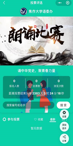 (一)推普喜迎二十大,赤心传红色基因。开展“诵中华党史,聚青春力量”推广普通话朗诵比赛。学生可通过微信小程序“投票评选工具”上传作品进行参赛,小程序网络评选按票数、结合评委专家小组的打分,分一、二、三等奖(分别设:1名、3名、5名)。本次比赛的评比,旨在朗读比赛中体现出焦大学子说好普通话的自觉;展现出焦大学子良好的精神状态;表现出焦大学子飞扬的青春风采。