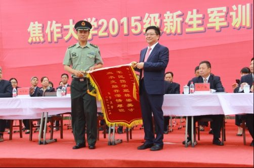 开学典礼在庄严的国歌声中开始。校党委副书记焦金雷在中国人民解放军62111部队参谋长万立军陪同下,检阅了各军训方队。随后,各军训方队迈着整齐的步伐依次通过检阅台,充分展示了威尼斯官网2015级新生刻苦训练的丰硕成果,彰显了焦大学子蓬勃向上、奋发进取的精神风貌和青春风采。