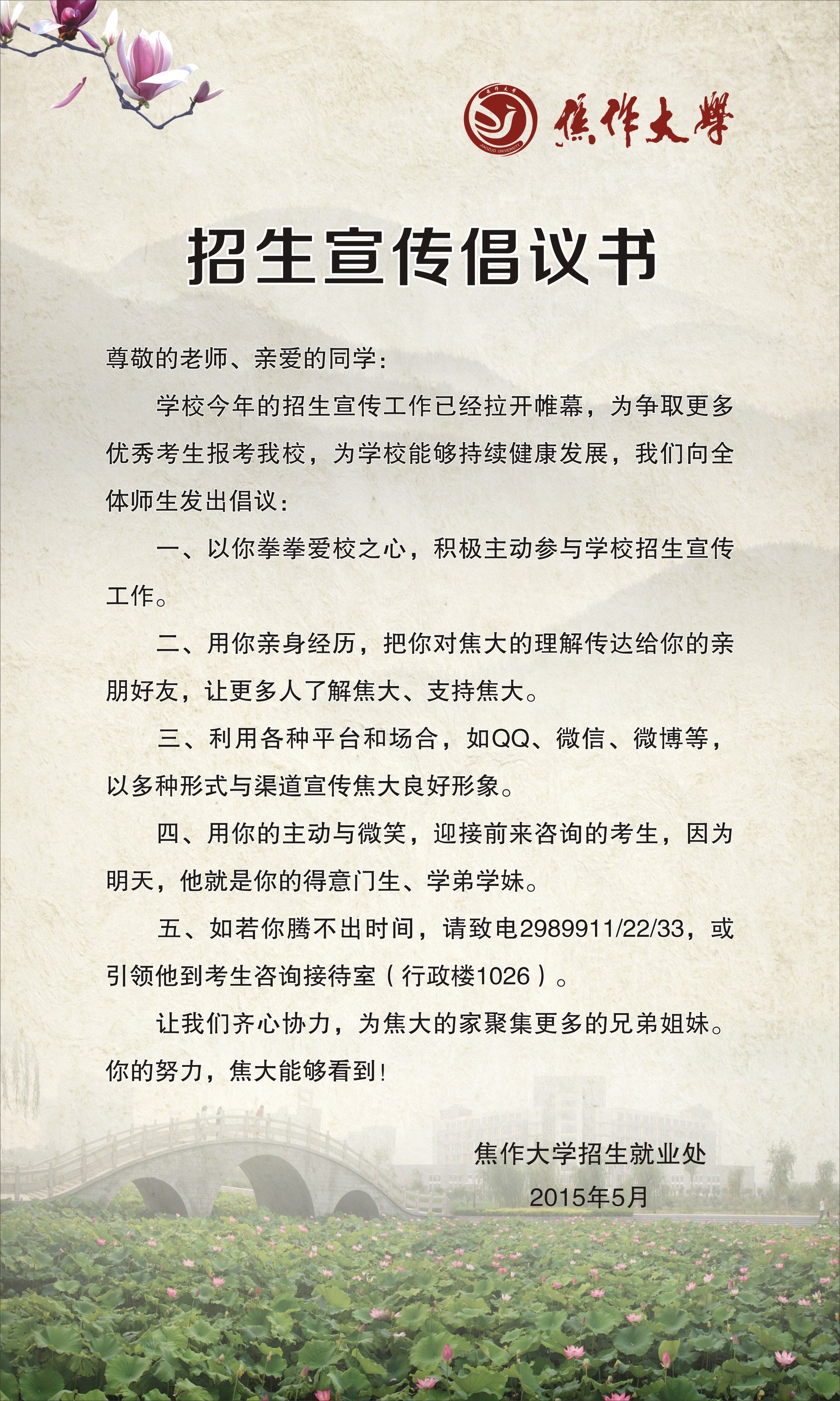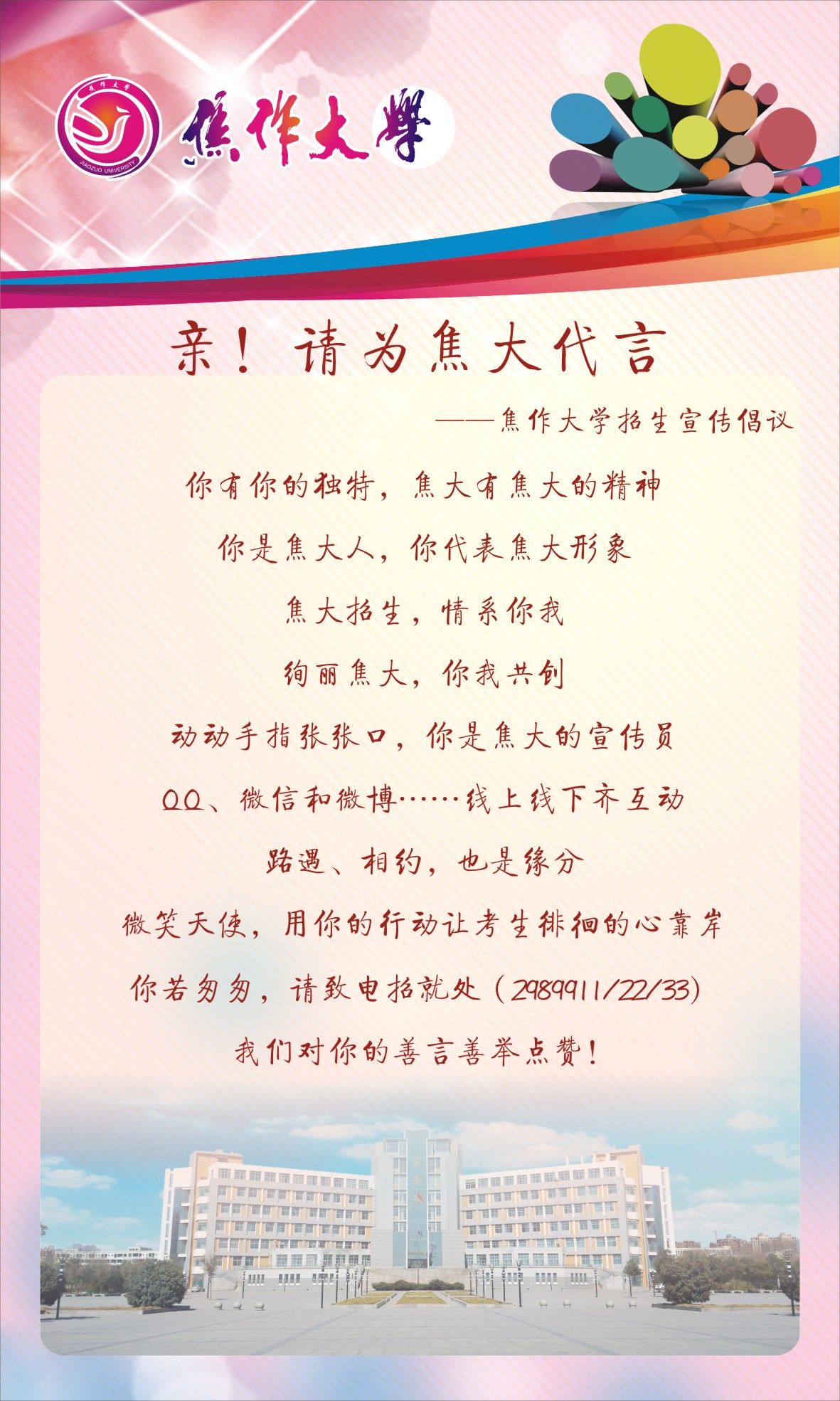 地址:河南省焦作市人民路3066号 邮编:454000 招生咨询电话:0391-2989911 2989922 2989933