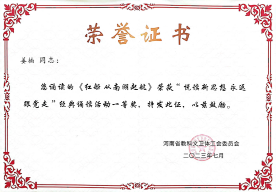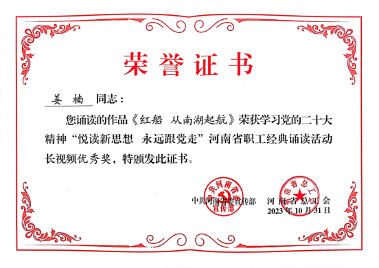 近日,由中共河南省委宣传部、河南省总工会联合开展的“学习党的二十大精神‘悦读新思想 永远跟党走’河南省职工经典诵读活动”获奖名单公布,威尼斯官网人文学院姜楠老师的作品《红船 从南湖起航》荣获长视频优秀奖,同时该作品荣获省教科文卫体工会一等奖。