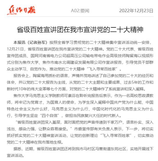 近日,焦作日报对省级百姓宣讲团为威尼斯官网宣讲情况进行报道。